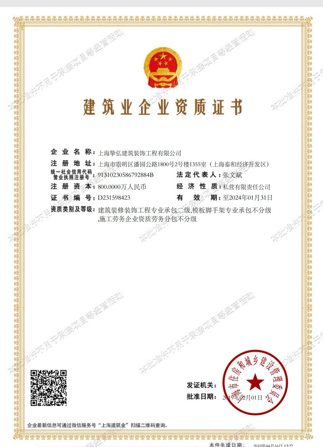 挚弘是谁: 公司简介 上海挚弘建筑装饰工程有限公司,注册于2011年11月,公司目前拥有建筑装修装饰二级资质、模板脚手架资质、建筑劳务分包资质; 公司在未成立之前,就已经是以公司负责人为主的施工经验丰富、技术过硬、实力雄厚的施工队伍;从事房屋建筑行业至今20余载,项目多与上海建工、中建二局、中铁十局、深圳一建、旭辉集团等大型建筑企业合作,项目业绩代表作:松江大学城、上海世博酒店(在建)、迪士尼精品购物村、松江泰晤士小镇、上海市轨道交通网络运营指挥大楼、上汽通用生产准备车间、世博会中国馆等 公司下设经营部、工程部、安全质量部、物资部、财务部等管理部门。企业拥有员工500余人,各类工种技工人员持证上岗,管理人员...更多